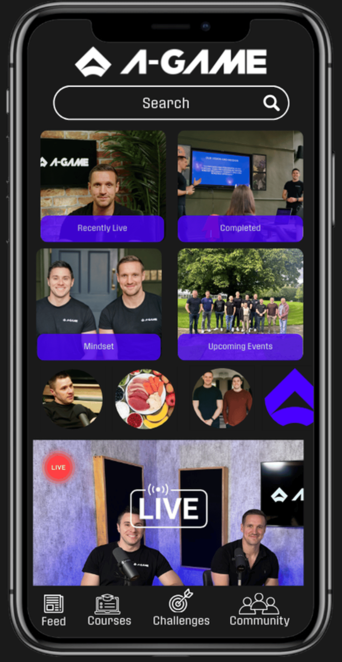 - Online Courses: On-demand access to A-Game’s courses covering mindset, health, habits, alcohol-free living and performance.
